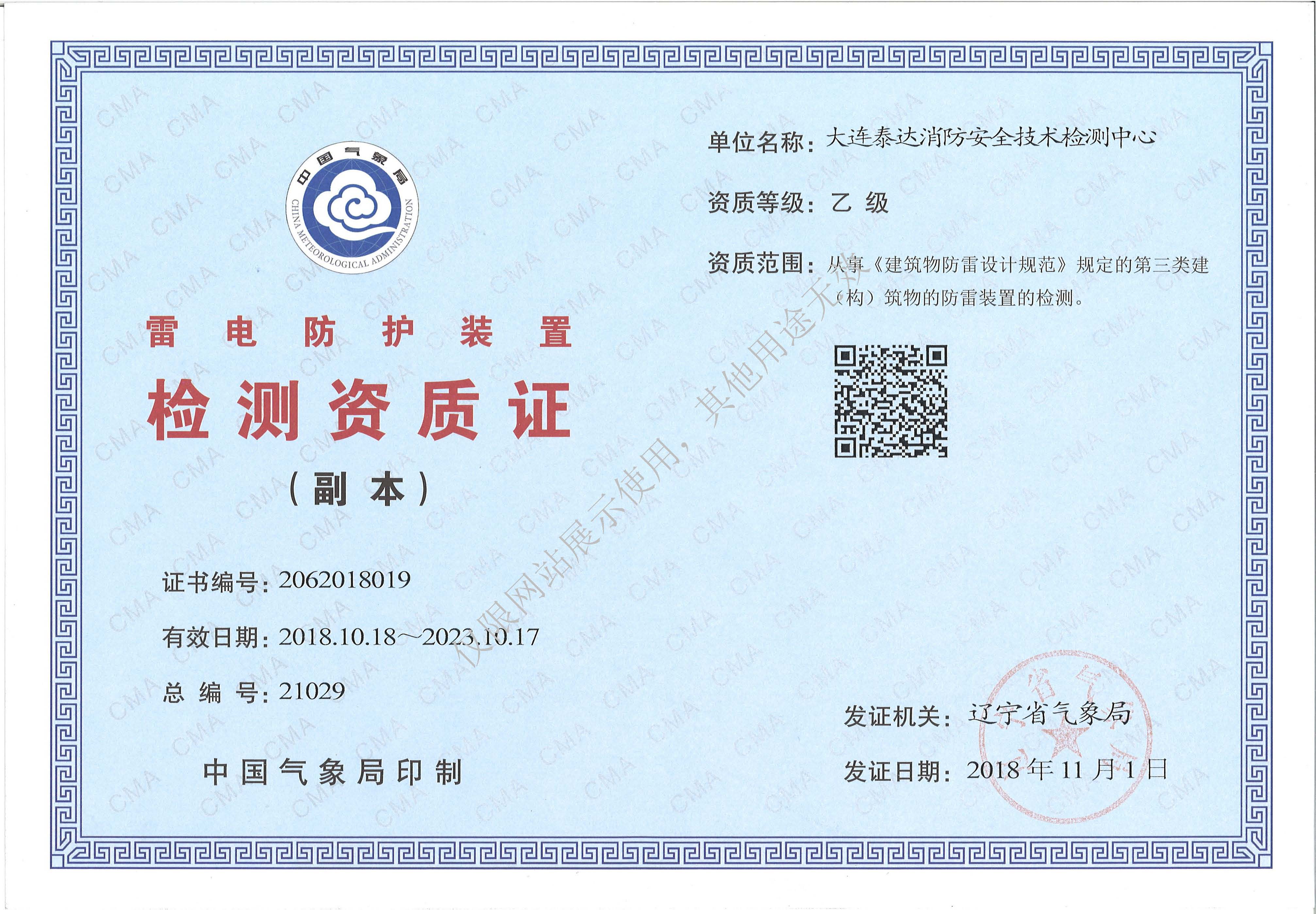 · 是經“社會消防技術服務信息系統”備案并公示的消防技術服務機構,已取得中國氣象局頒發的雷電防護裝置檢測資質證書、遼寧省質量技術監督局審核批準的檢驗檢測機構資質認定證書(CMA)及包括消防檢測、電氣檢測、雷電防護裝置檢測、防火涂層厚度檢測等在內的200余項檢驗檢測能力,取得大連市應急管理局頒發的安全生產標準化證書,獲得質量管理體系、環境管理體系、職業健康安全管理體系認證證書,是經備案的高新技術企業,可獨立出具具有證明作用的檢測報告。